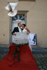 Bevor das Brautpaar die zwei weissen Tauben aus den Händen starten läßt, gibt es für die Fotografen bzw. Videografen den Kuss des Brautpaares. Hier tragen dann die zwei weissen Brieftauben die Wünsche des Brautpaares in den Himmel.