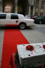 Bei der Buchung unseres roten Teppich empfehlen wir an dem einen Ende des Teppichs den weissen Taubenkorb aufzustellen und am anderen Ende das Hochzeitsfahrzeug zu parken. So kann das Brautpaar auf der einen Seite des roten Teppichs die weissen Tauben starten und auf der anderen Seite Fotoaufnahmen mit dem Hochzeitsfahrzeug machen.