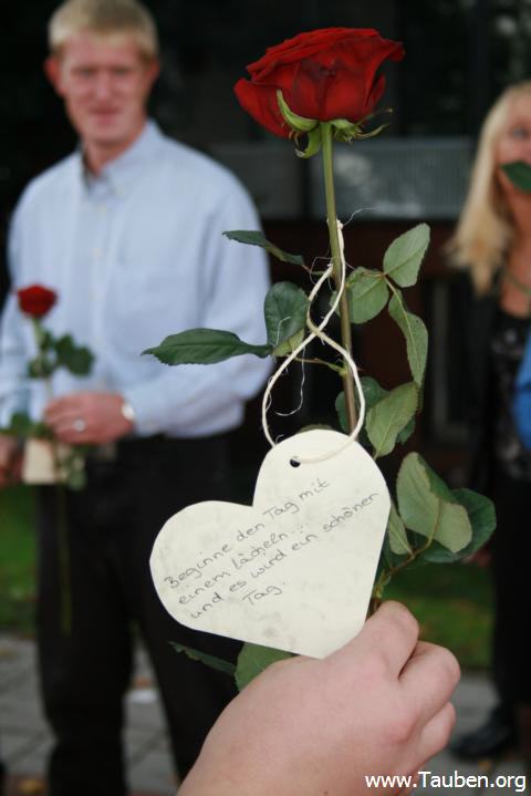 Wenn das Brautpaar das Gebäude verläst, werden gewöhnlich zuerst die Glückwünsche der Gäste vom Hochzeitspaar entgegen genommen. In dieser Zeit kommt unter den Gästen häufig "langeweile" auf. Es entstehen kleine Gruppen die sich zusammen finden und diskutieren. Hier empfehlen wir den Hochzeitsgästen entweder langstielige Rosen oder rote Heliumherzluftballons in die Hand zu geben. Die anwesenden Fotografen und Videografen haben hier die Möglichkeit entspannte und gut gekleidete Menschen getrennt von einander zu fotografieren.