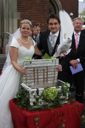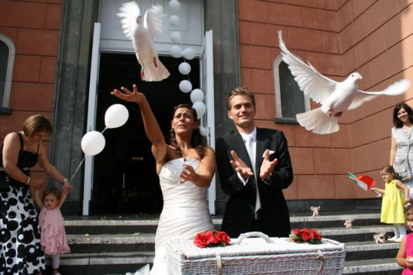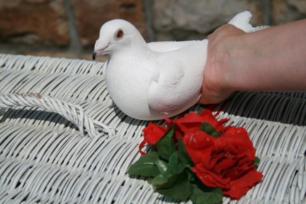 Hochzeitstauben Wir liefern kurzfristig, zuverlässig und zu Festpreisen zu TRAUMHOCHZEITEN in ganz NRW. Weiße Hochzeitstauben: Wir liefern 8 weiße Hochzeitstauben zu Ihrer Veranstaltung mit Tisch, Weidenkorb, Dekoration und Rosengirlande. 2 weiße Hochzeitstauben bekommt das Brautpaar fachgerecht für Fotoaufnahmen in die Hände gelegt. Nach 3 - 5 Minuten Fotoshooting starten die zwei weißen Tauben aus den Händen des Brautpaares. Die übrigen 6 weißen Hochzeitstauben startet das Brautpaar gemeinsam aus dem weißen Weidenkorb durch anheben des Deckels. So hat jeder Foto- bzw. Videograf 2x die Möglichkeit das glückliche Brautpaar mit startenden weißen Tauben zu filmen oder zu fotografieren.