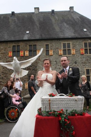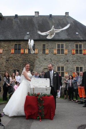 Hochzeitstauben vor der St. Laurentius Kirche in Wuppertal.  | |  | Start aus den Händen - Kloster Stiepel | | Start aus den Händen - Haus Herbede, Witten |